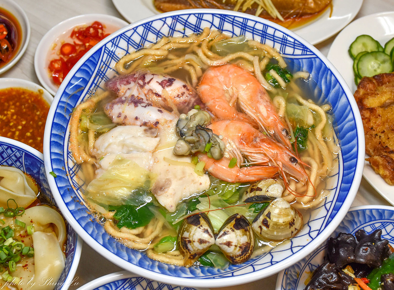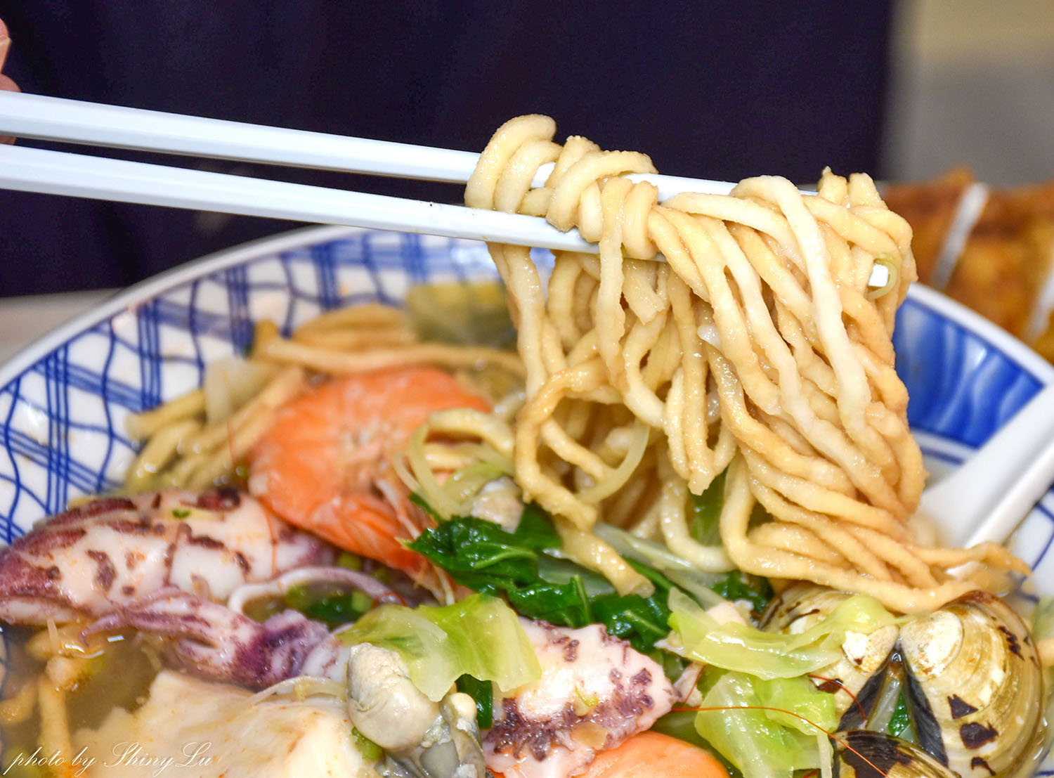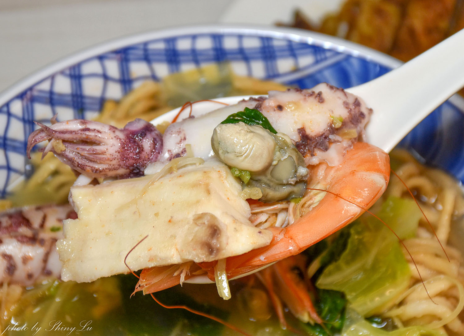 綜合海鮮意麵:料超多,多到快滿出來的哪種,裡面有白蝦、鮮蚵、魚片、蛤蜊、中卷…等,隨便一撈都是料