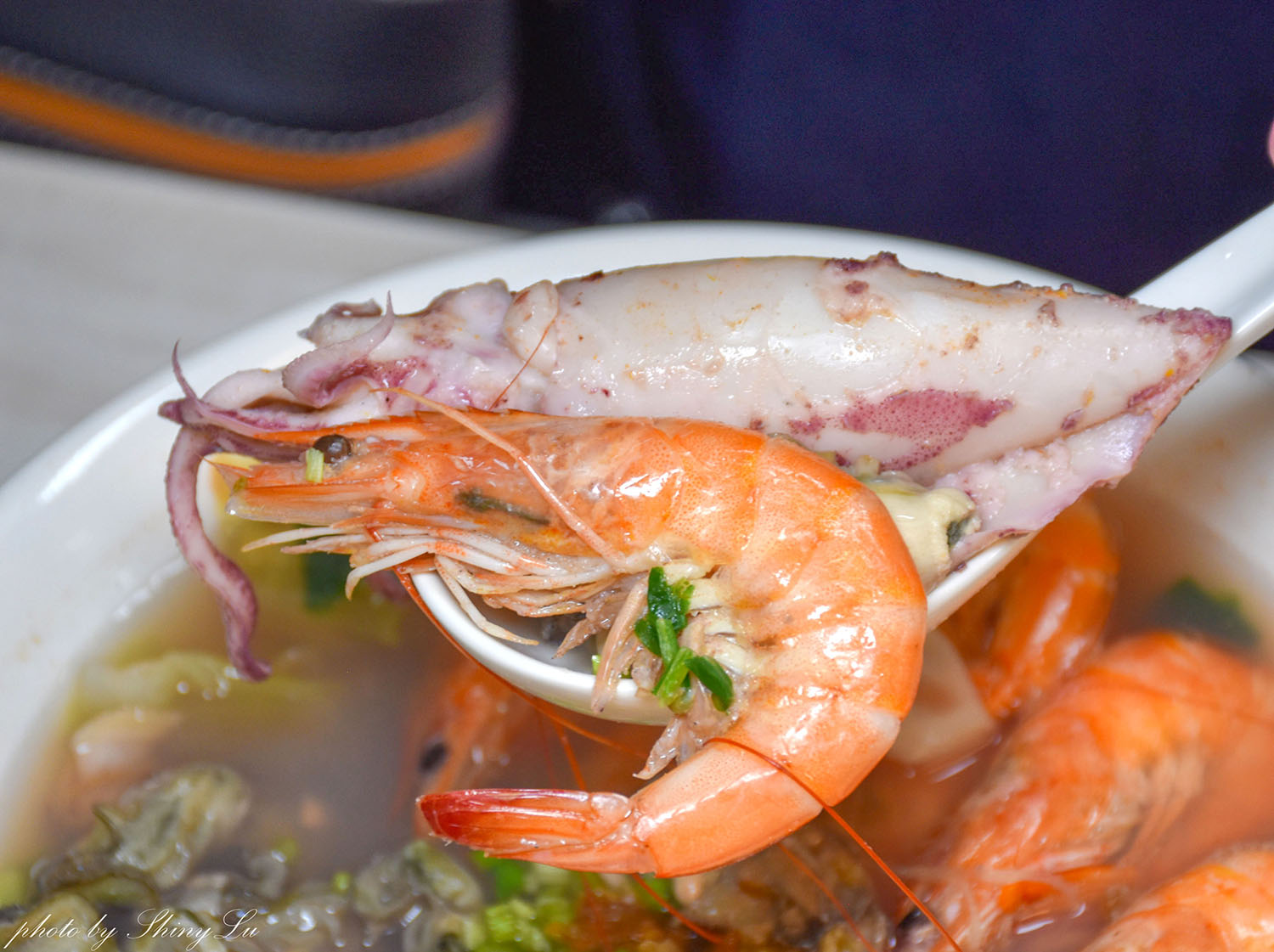 蝦子的份量好多,還有滿滿的中卷、鮮蚵…等海鮮,湯頭也超讚,滿滿鮮味很甘甜,我們把剩下的湯底打包回家,加入米飯煮成粥,超讚的