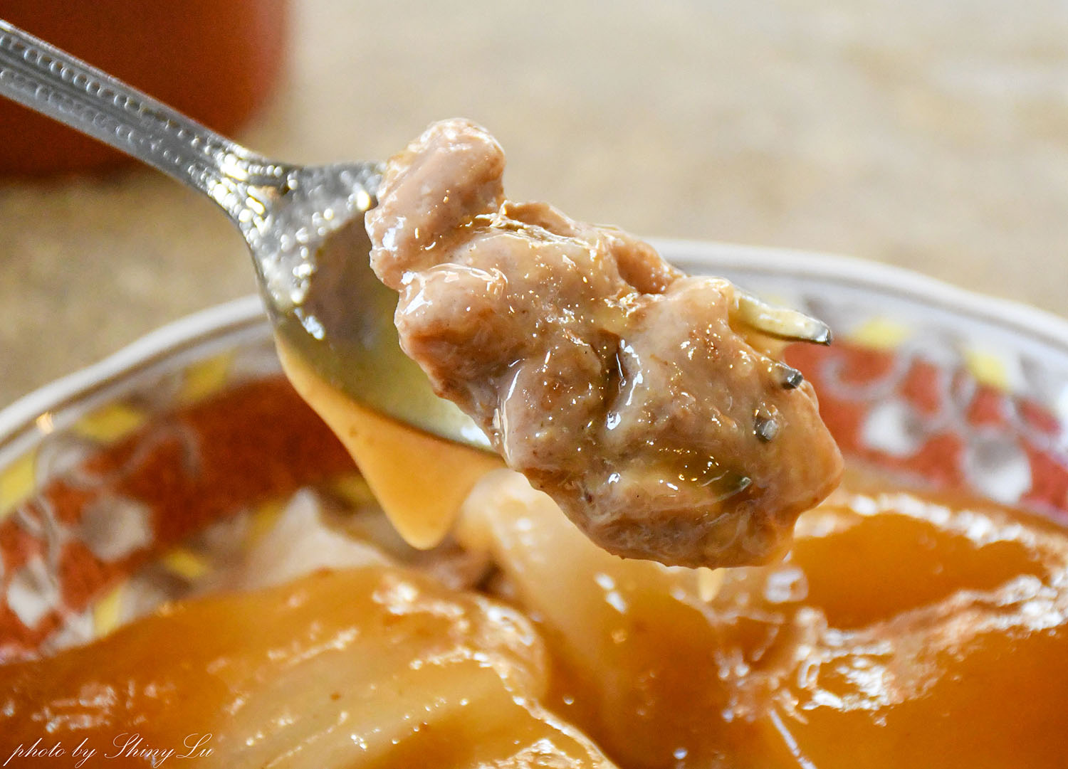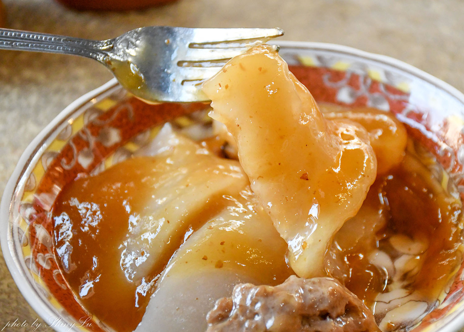 肉圓是帶微透明的淡黃色,皮很薄透,還滿軟Q的,我載牙套的人都可以輕鬆咬