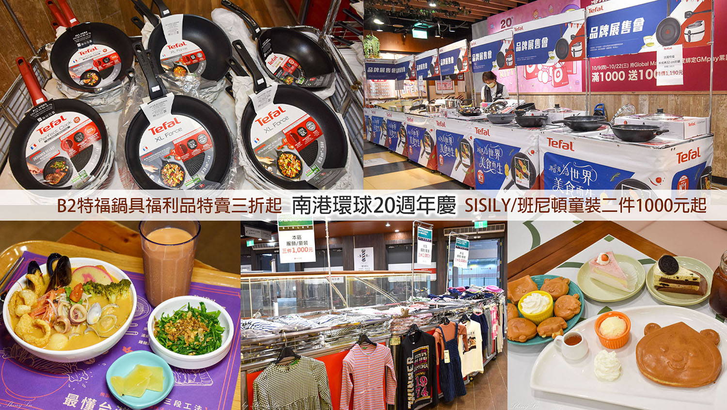 歡慶環球20週年!Global Mall環球南港車站,位於南港車站大樓內,是一間與高鐵/台鐵/捷運共構的百貨商場,尤其B1美食街深受附近居民喜愛,這次快閃櫃活動很划算,特福鍋具福利品特賣三折起,SISILY/班尼頓童裝二件1000元起,還有ME5精品剪具價格也很甜,大家吃覓食的同時,別忘了趁機會血拼搶便宜哦
