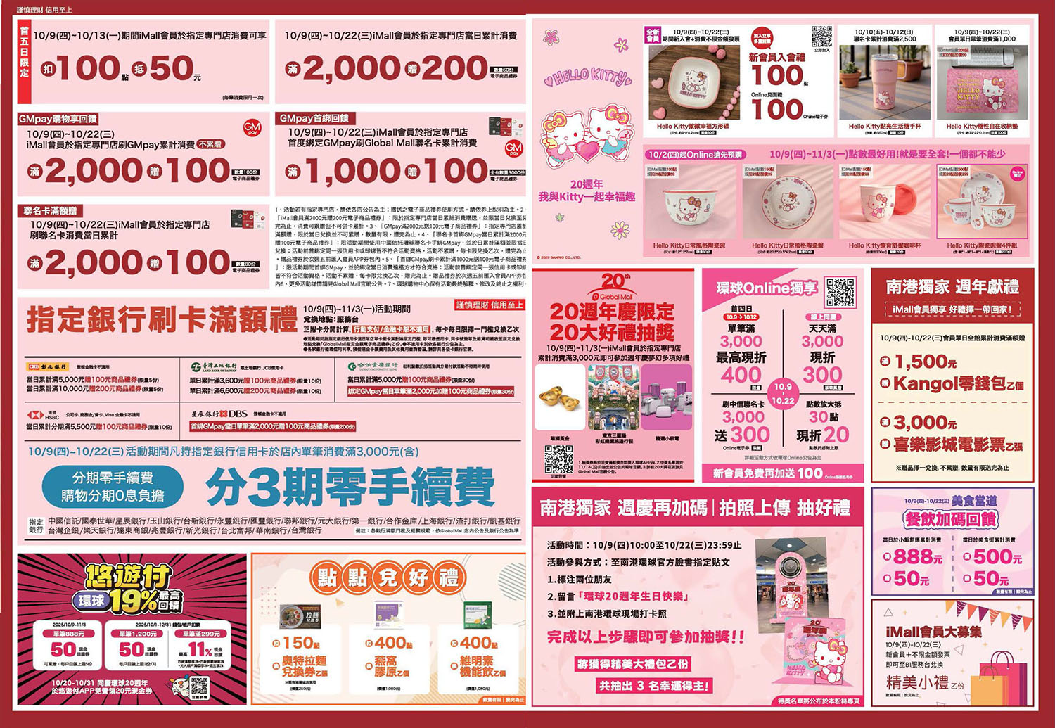 GlobalMall環球南港車站20週年慶,活動超豐富!指定專門店/日期享滿額贈,會員滿額禮、會員點數還可預購限量的Kitty餐具杯子,10/9-11/3指定專門店消費滿3千可參加抽獎,有機會到東京三麗鷗彩虹樂園旅行程,還有多種優惠活動哦