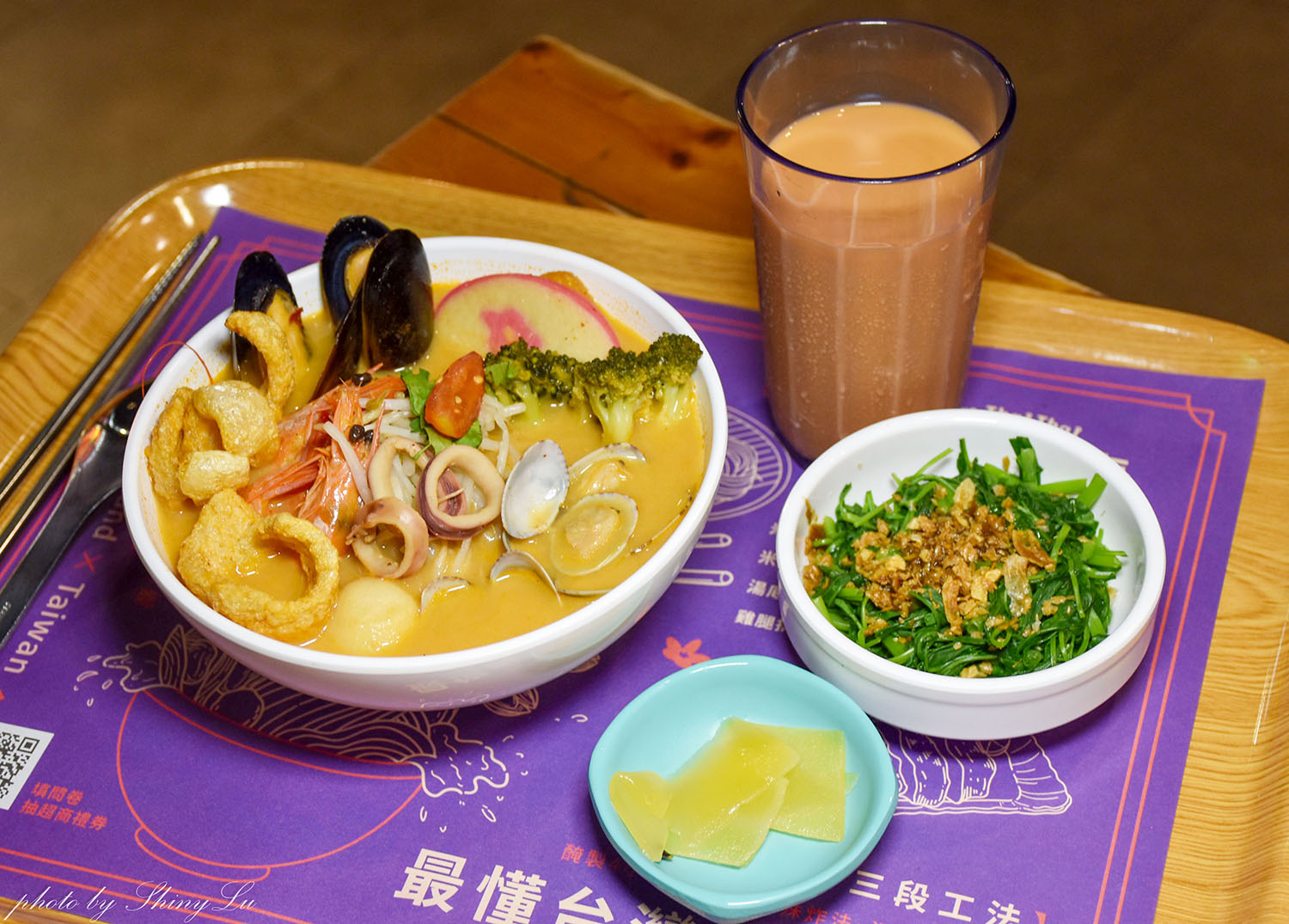 東央酸辣海鮮麵,升級B套餐(泰式奶茶+蝦醬空心菜)