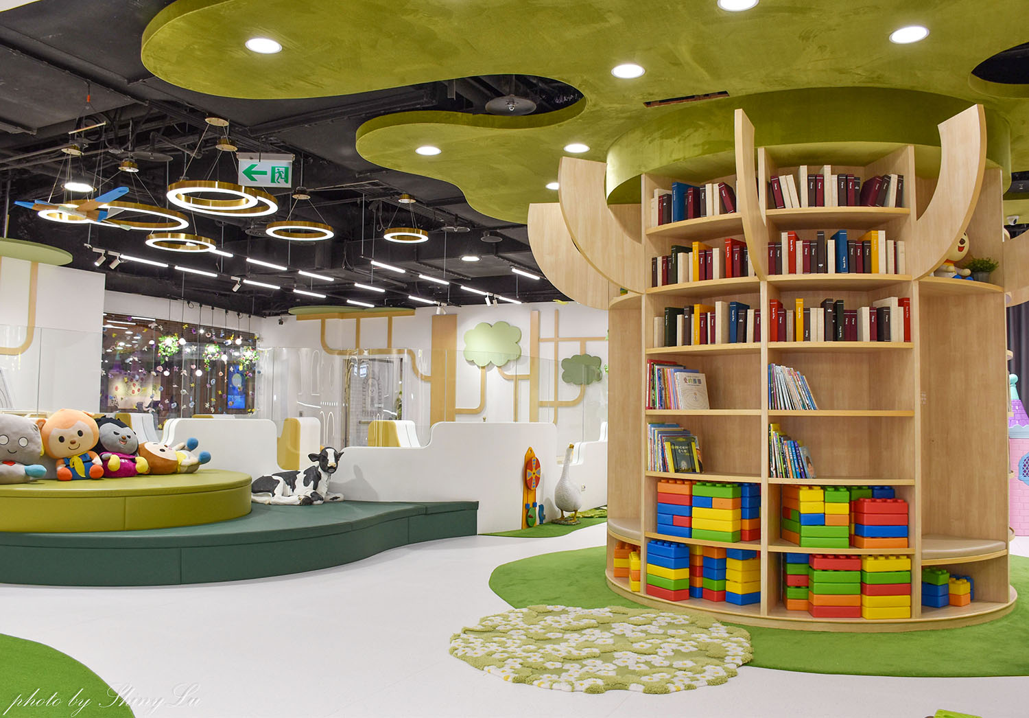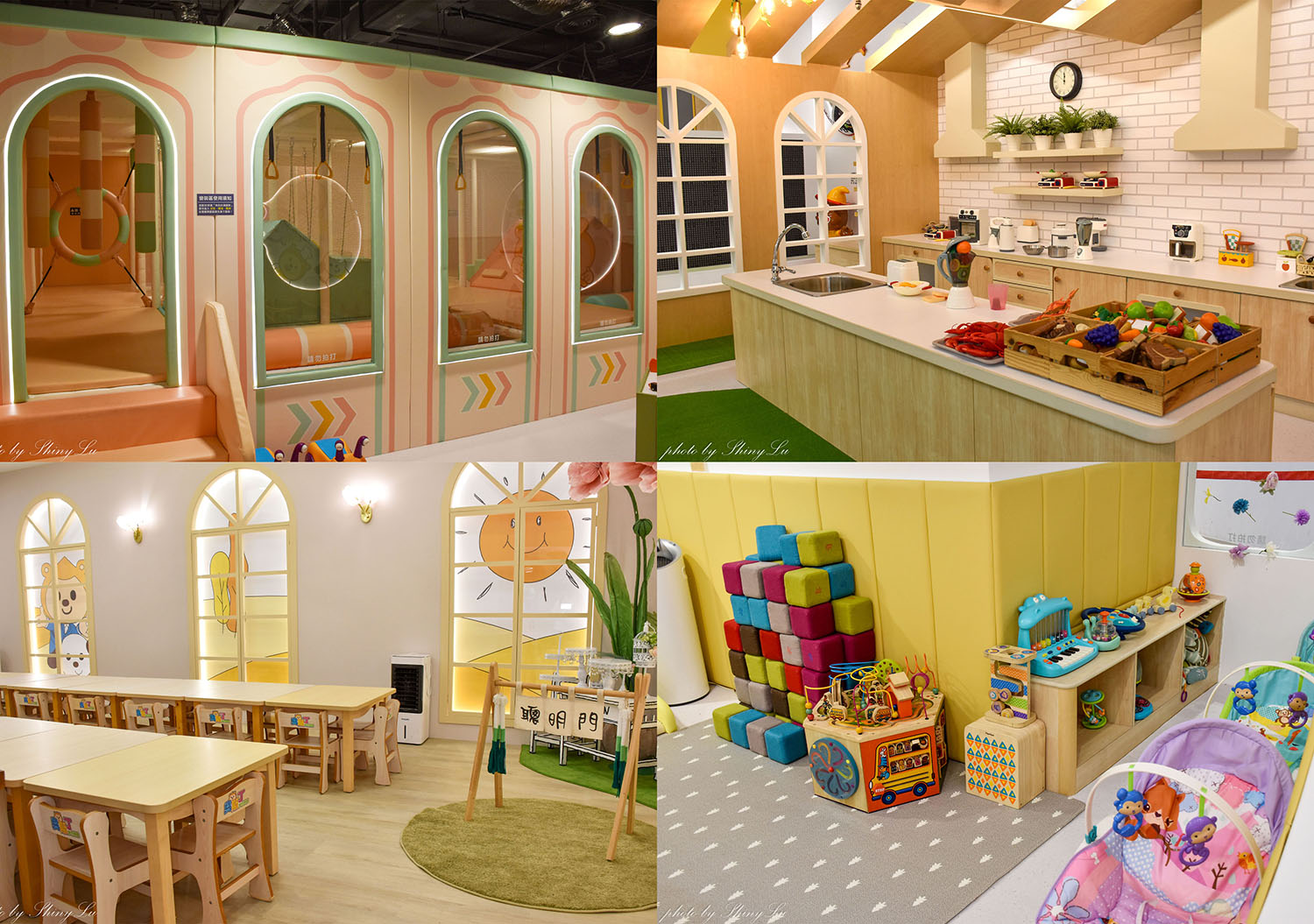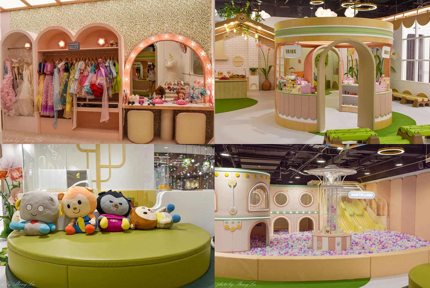 光影球池,小木屋、朵朵百貨、閱讀樹、茉莉花園、小女孩最愛的辦家家酒及變裝區,還有2歲以下的小寶貝的專屬空間