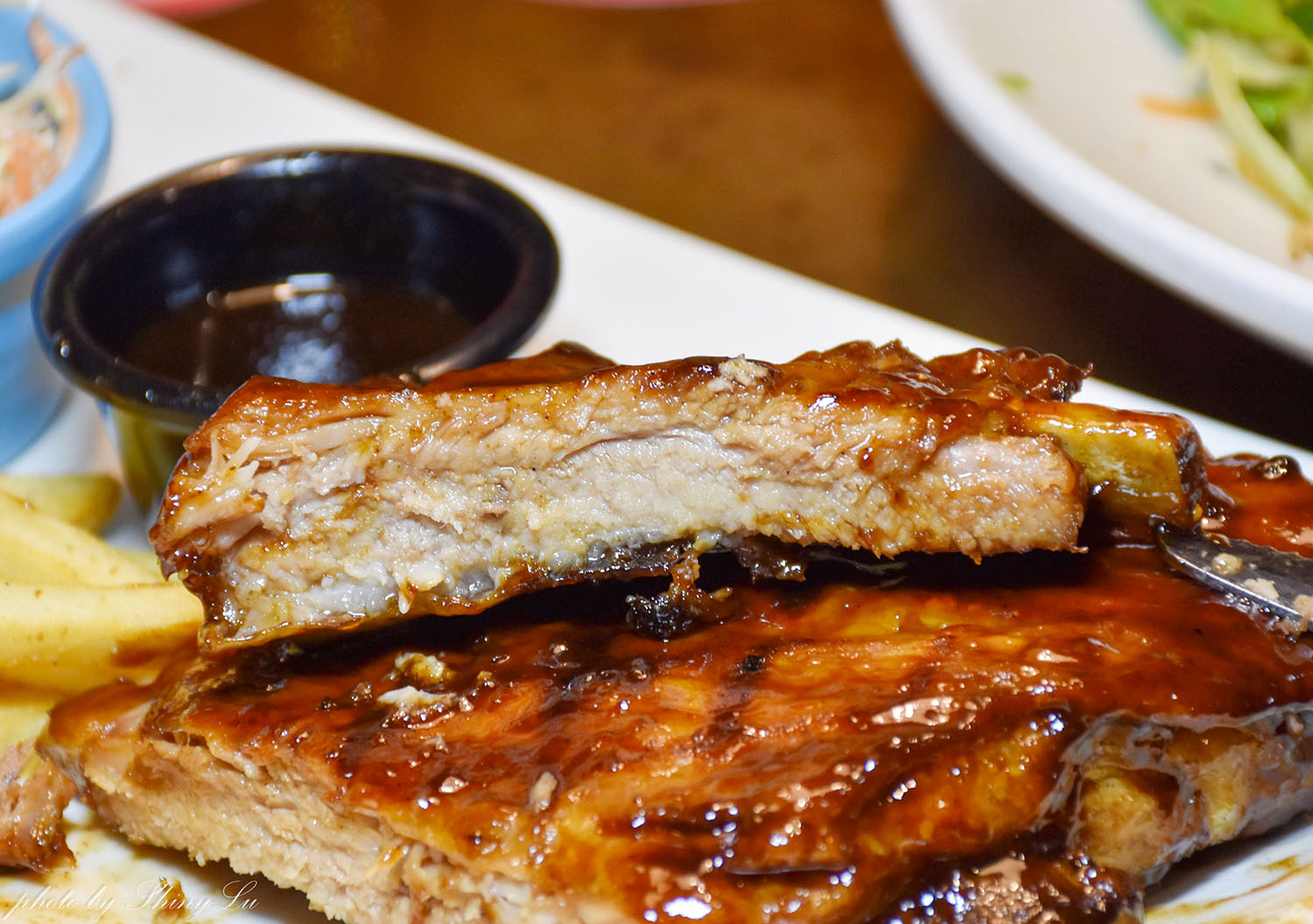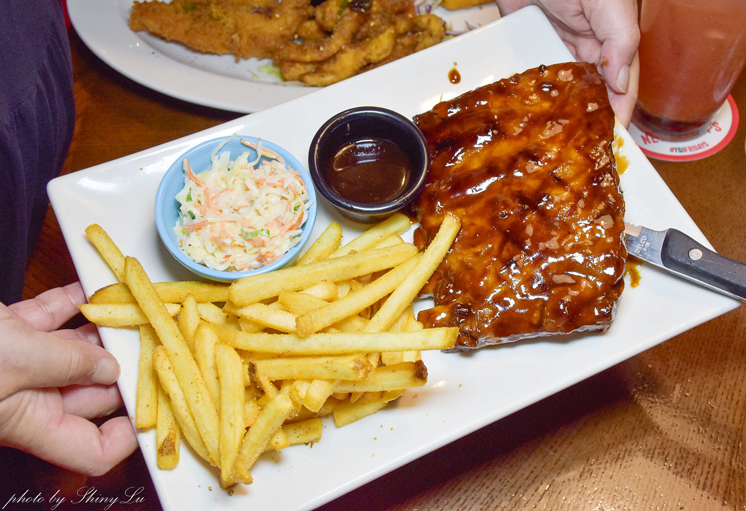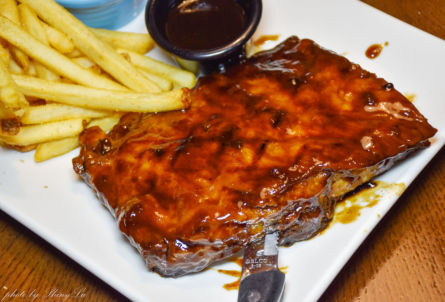 半份雙醬肋排:整塊的豬肋排,搭配紐奧良調味料及雙醬(蘋果烤肉醬+田納西威士忌甜酒醬)豬肋排多汁綿密不會柴,醬汁很棒,有點果香很增加風味,也吃得到炭烤的焦香