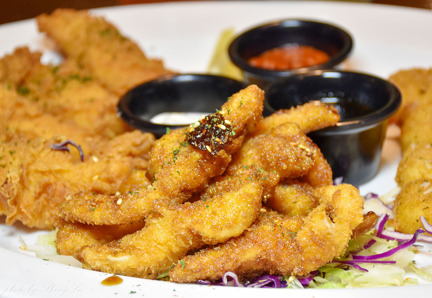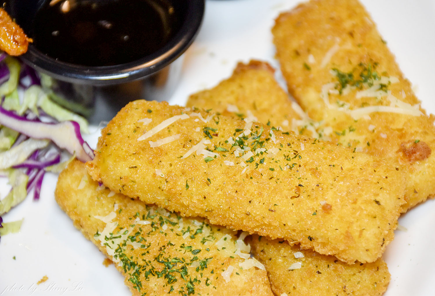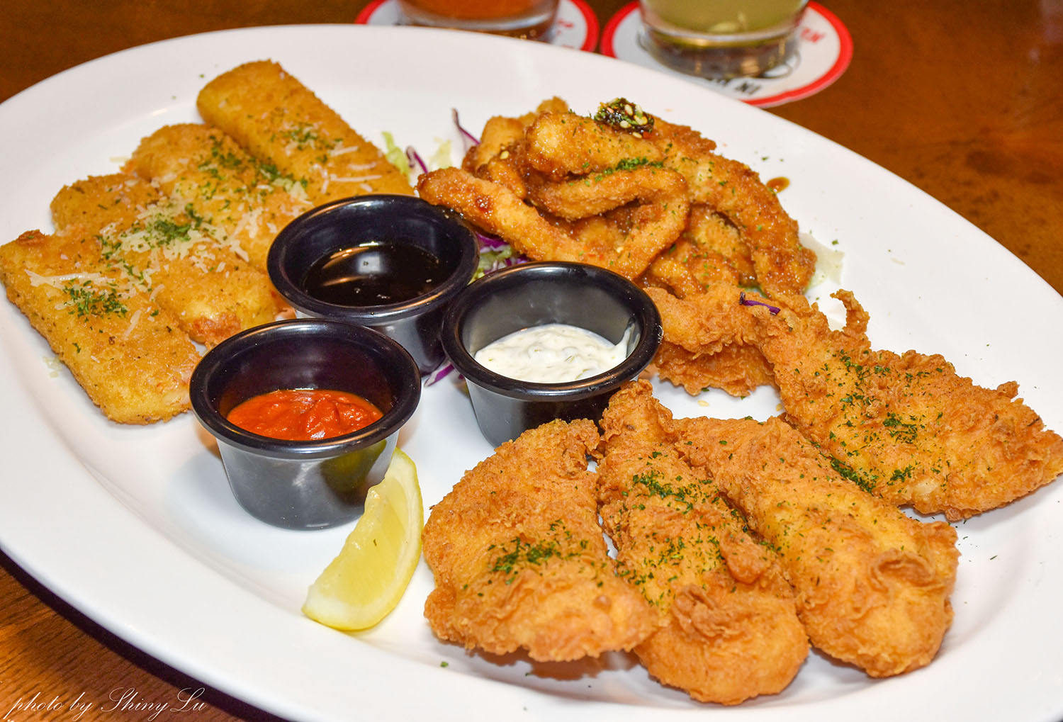 自創開胃菜組合:指定選項中任選三樣開胃菜組成一份(我們選香酥馬芝拉條、田納西芝麻雞柳、英式炸魚薯條 )