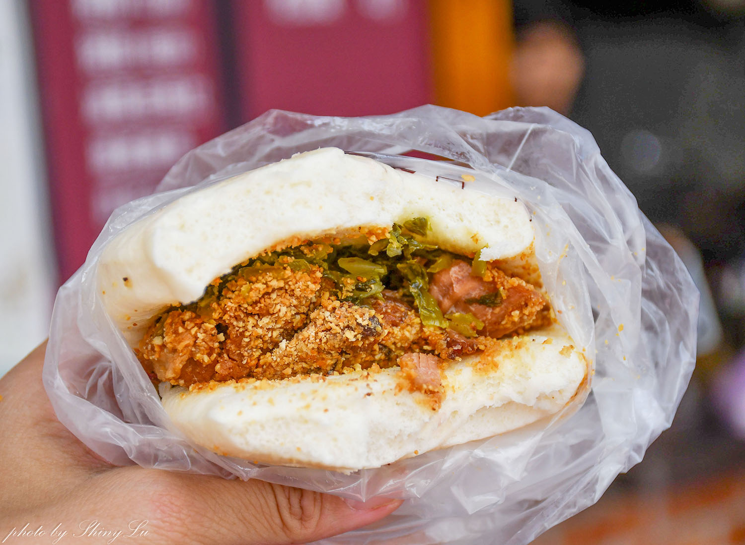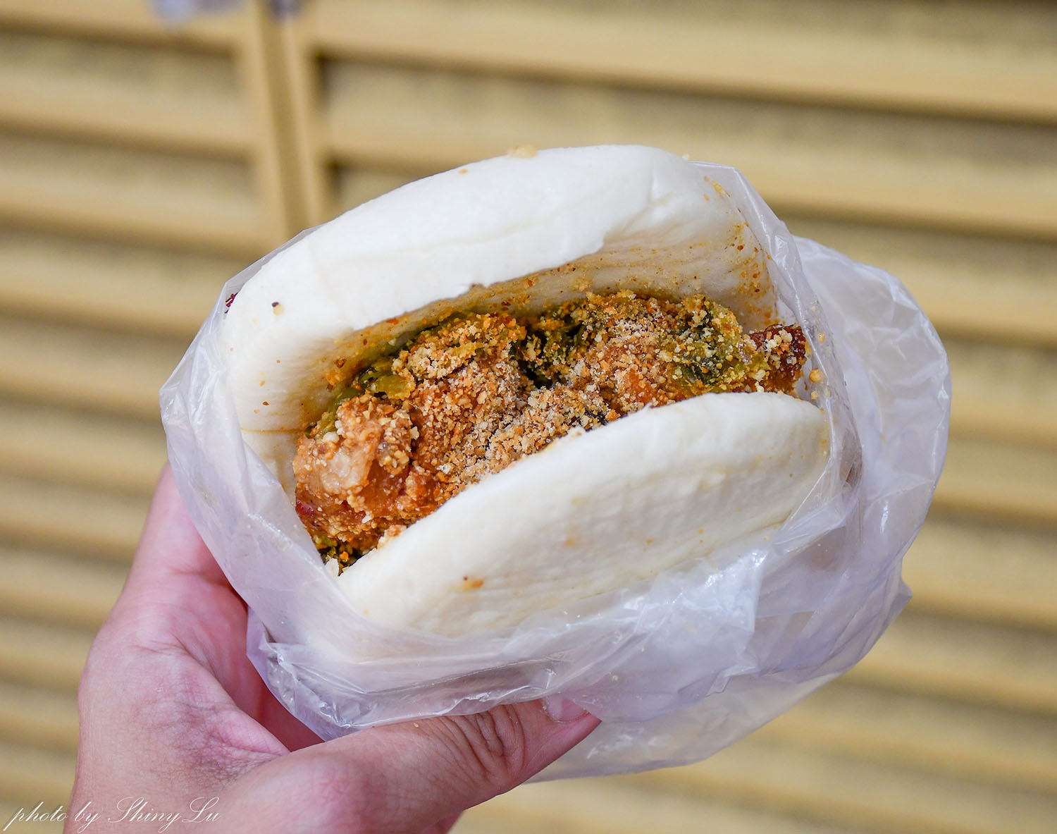 我們是選瘦肉的刈包,裡面滿滿的花生粉、酸菜和香菜,爌肉滷的入味,口感鹹香不乾柴,餅皮澎澎的很有咬勁,整體口感飽滿又厚實,吃完一個很有飽足感