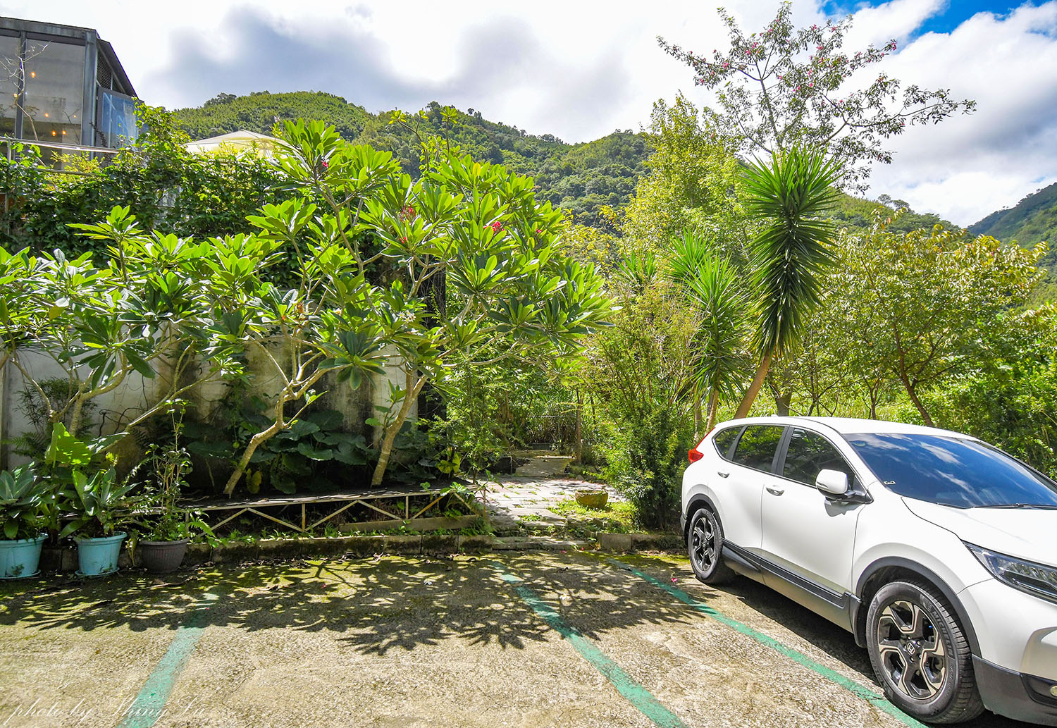 店家有附停車場, 但需要從這個下坡進入,店家有告示牌說明,只能停三台車,而且坡度很高,需馬力足的車再進入比較好