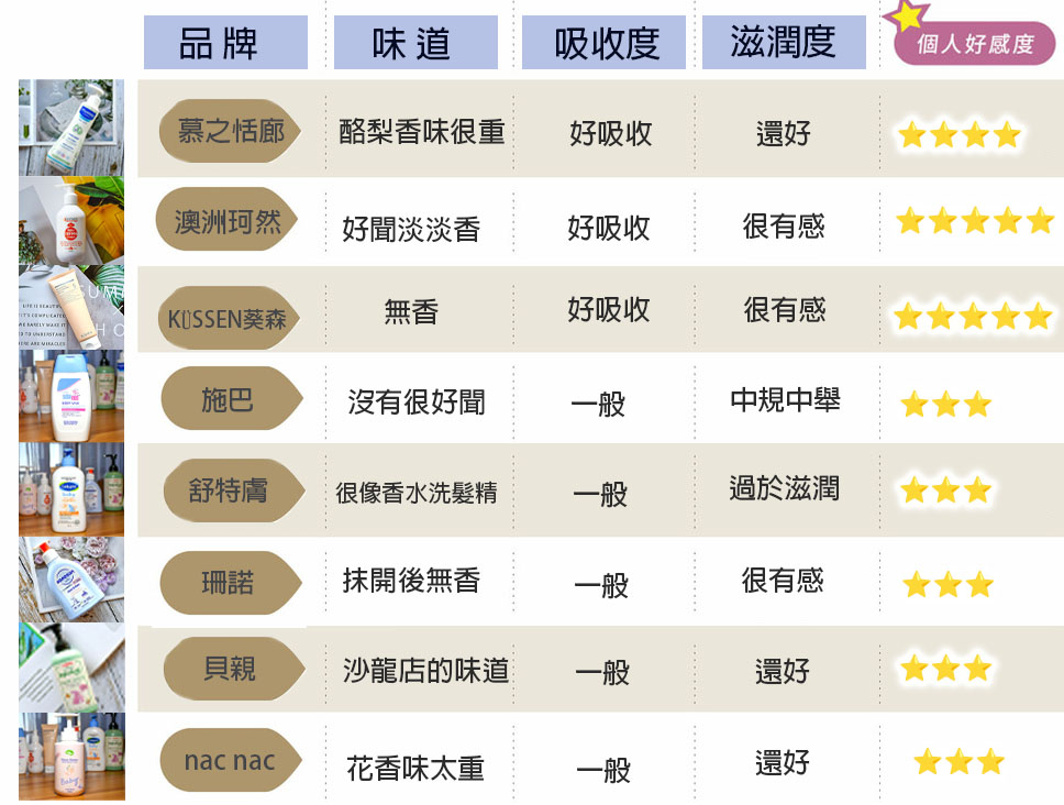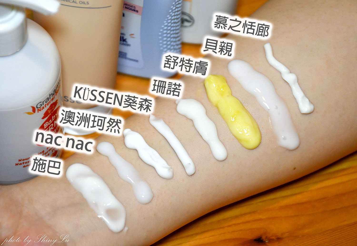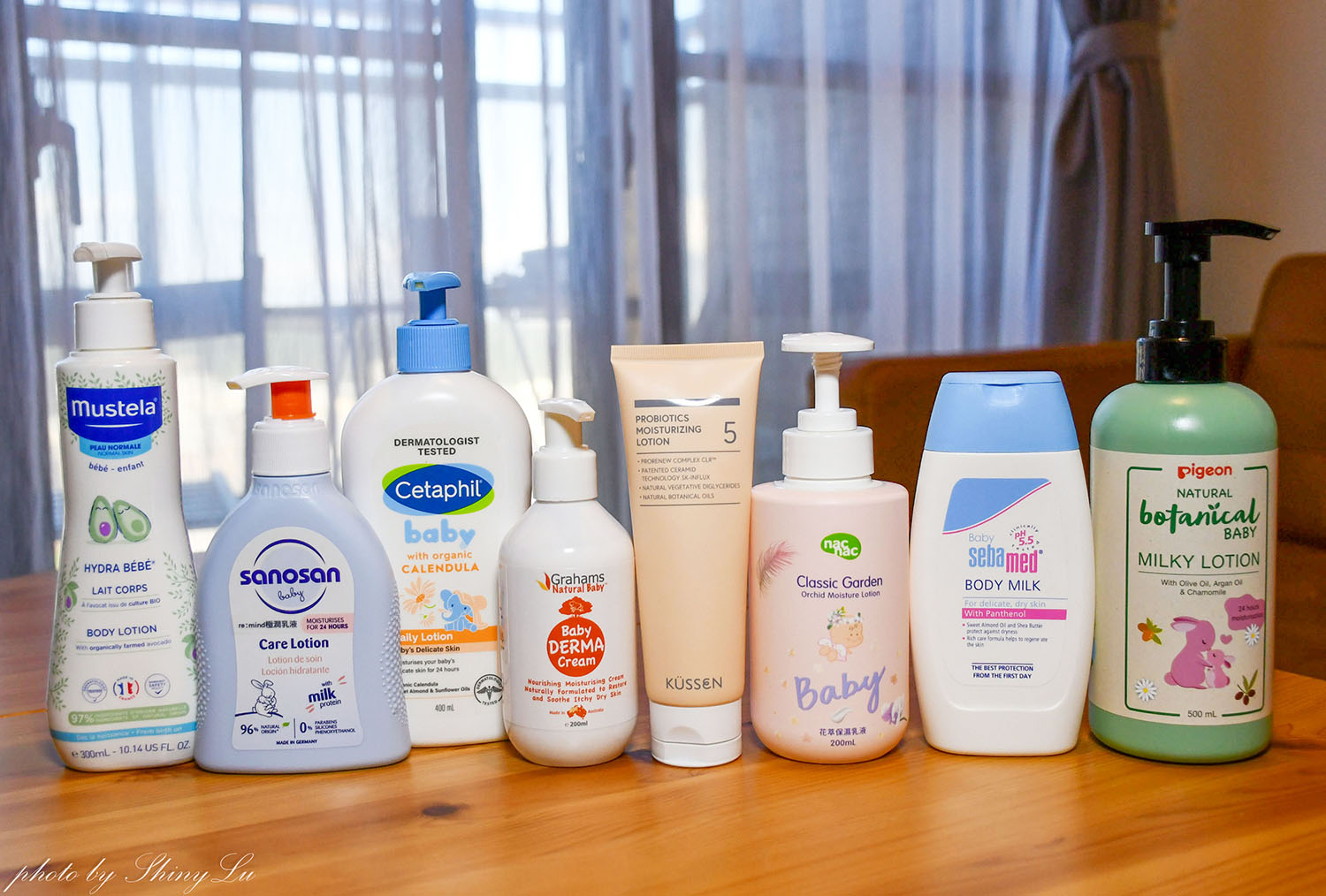 本篇寶寶乳液品牌有:慕之恬廊、澳洲珂然、KÜSSEN葵森、施巴、舒特膚、珊諾、貝親、nac nac,都是知名大品牌,母嬰用店大多買得到