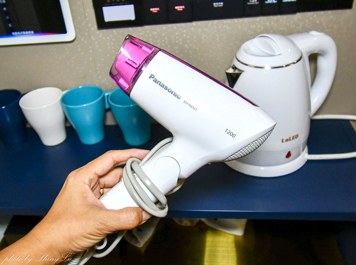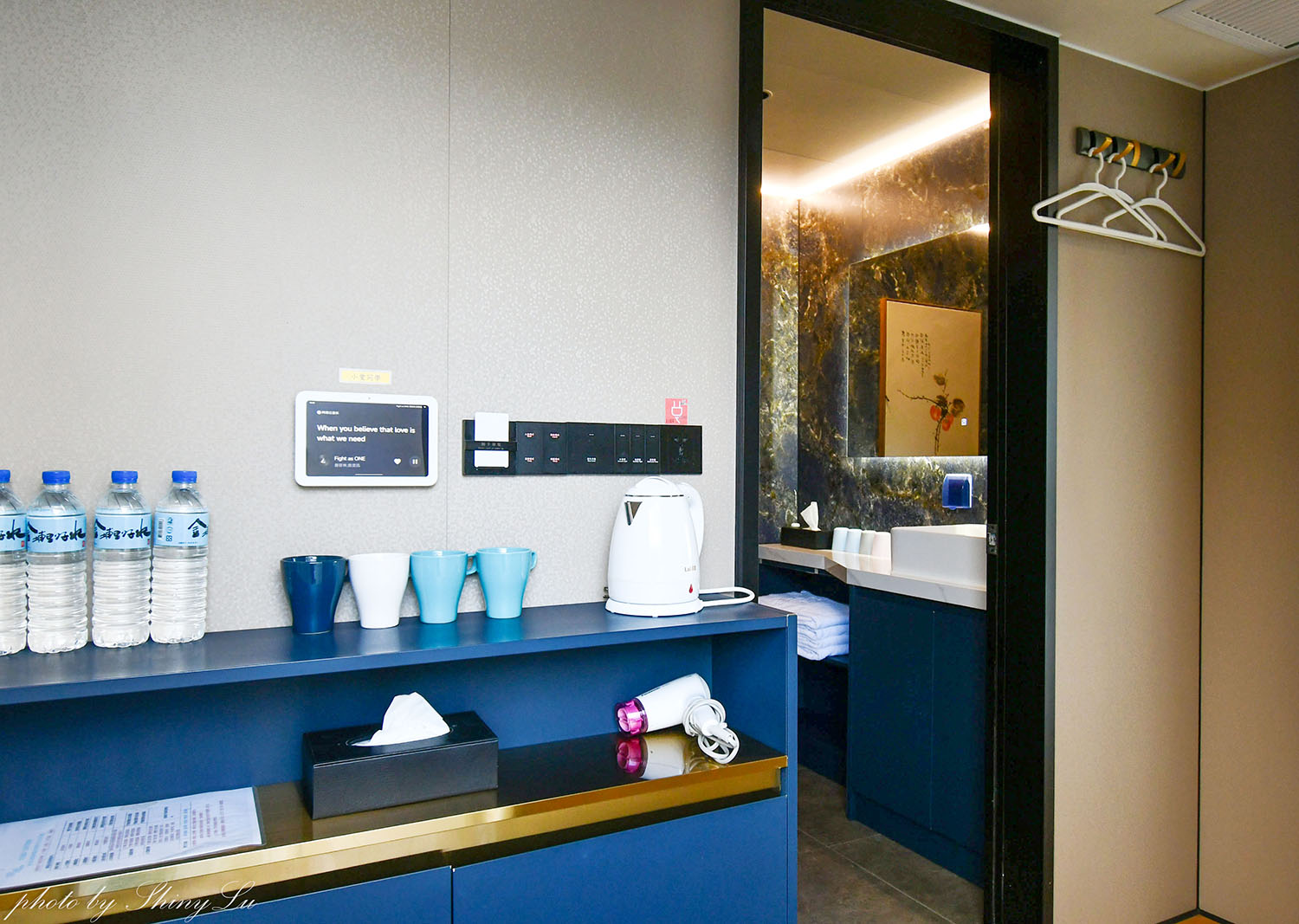 有水杯、礦泉水、電熱水瓶,吹風機,配備還滿齊全的