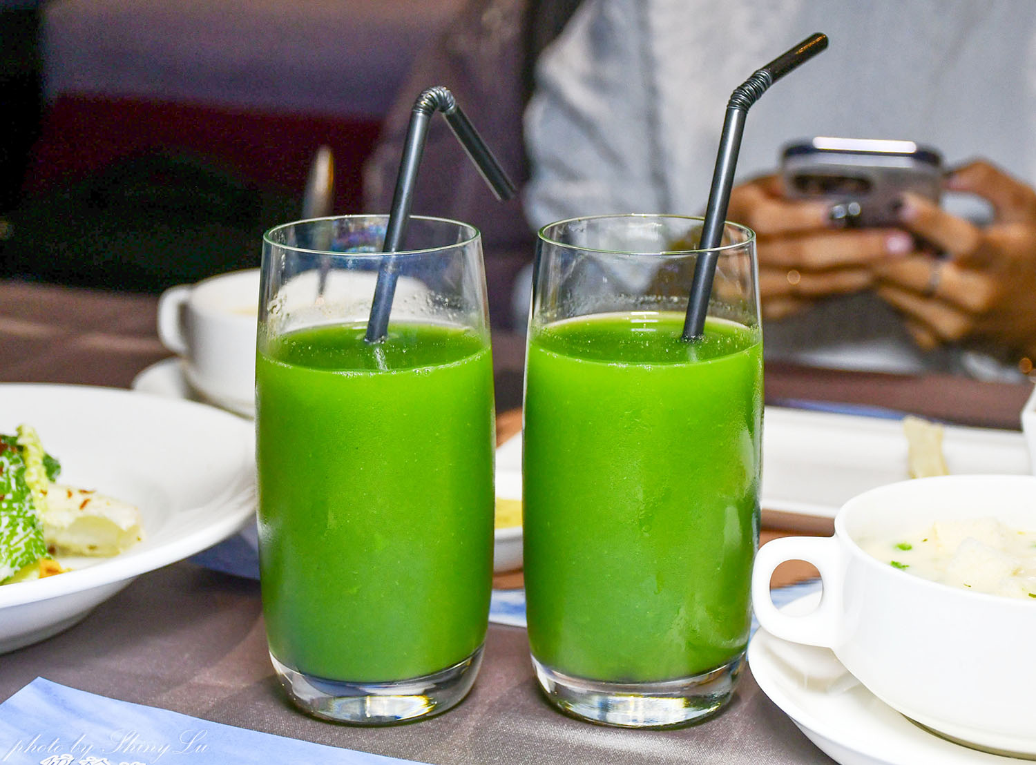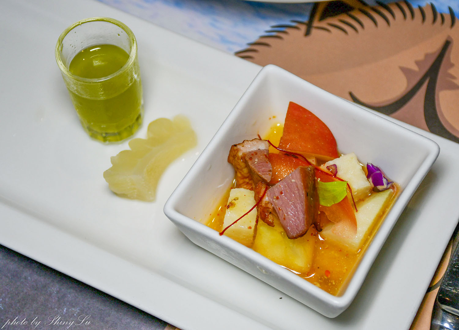 這是店家自製的五葉松汁,口感就是滿滿的蔬菜味,但不會過於青澀,吃飽來一杯很解膩