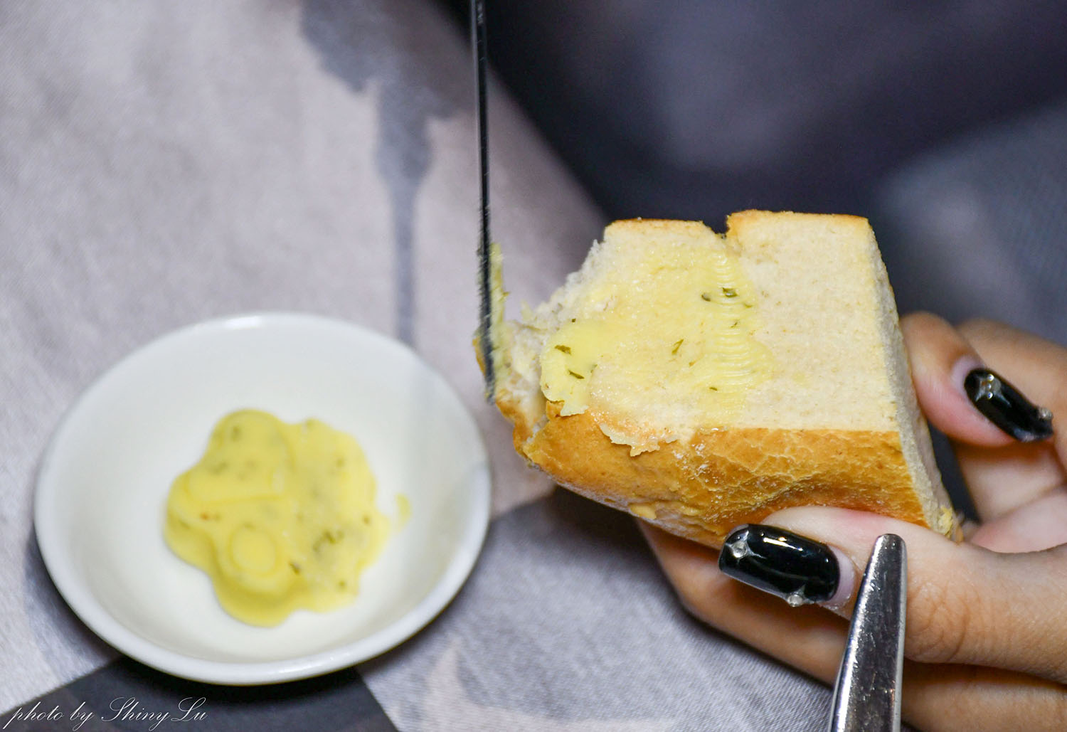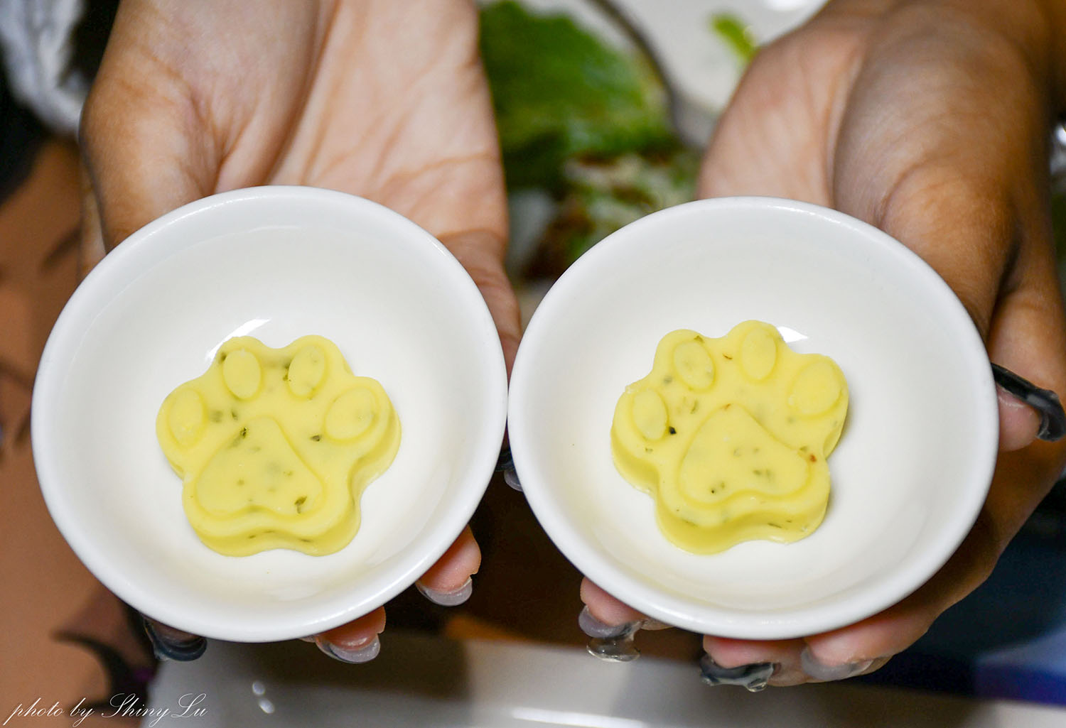 附上二個狗狗腳印造型的蒜香奶油醬,也可以沾麵包吃