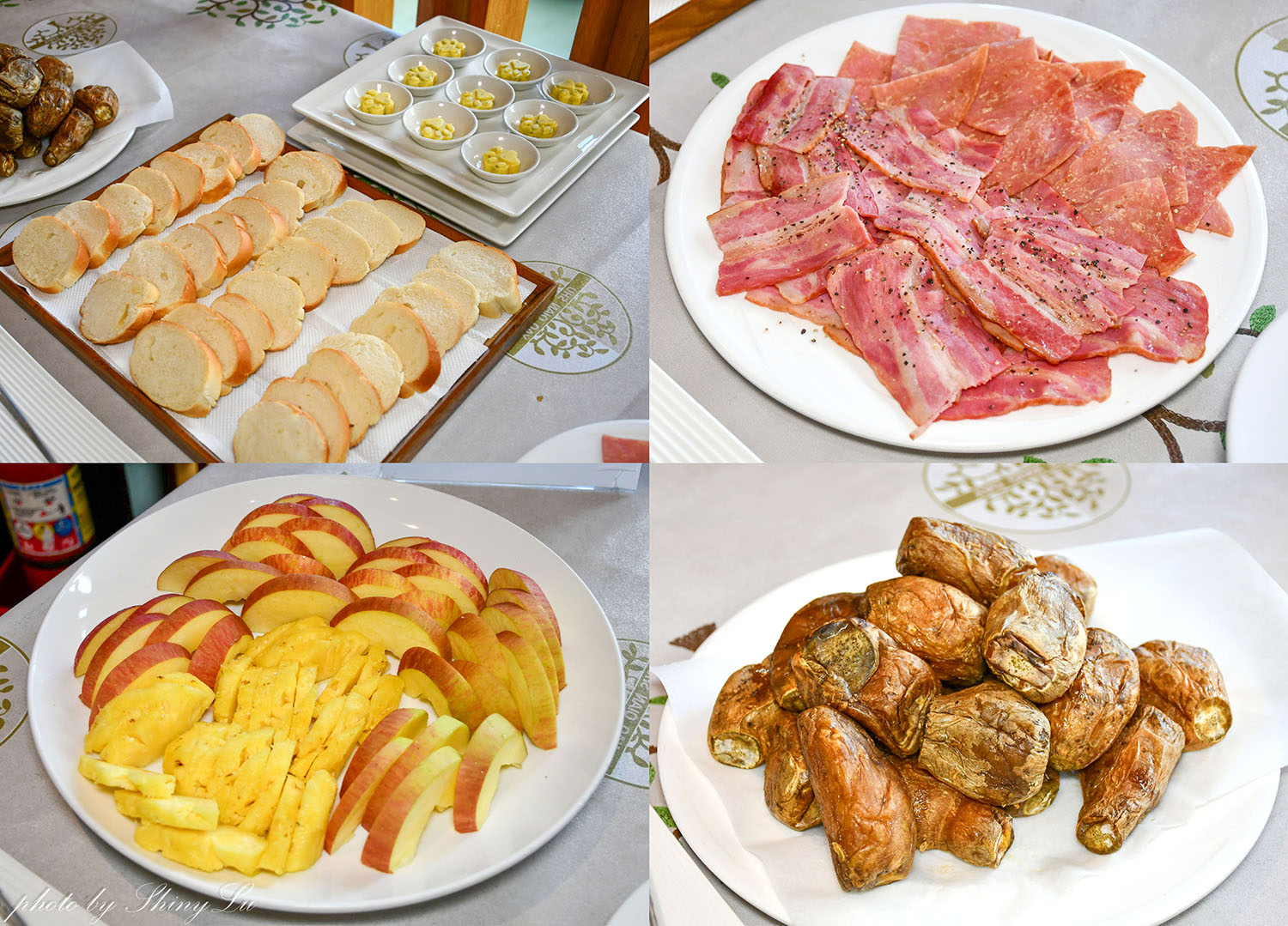 有水果、地瓜。麵包可以搭配蒜香奶油醬,或旁邊的培根跟火腿
