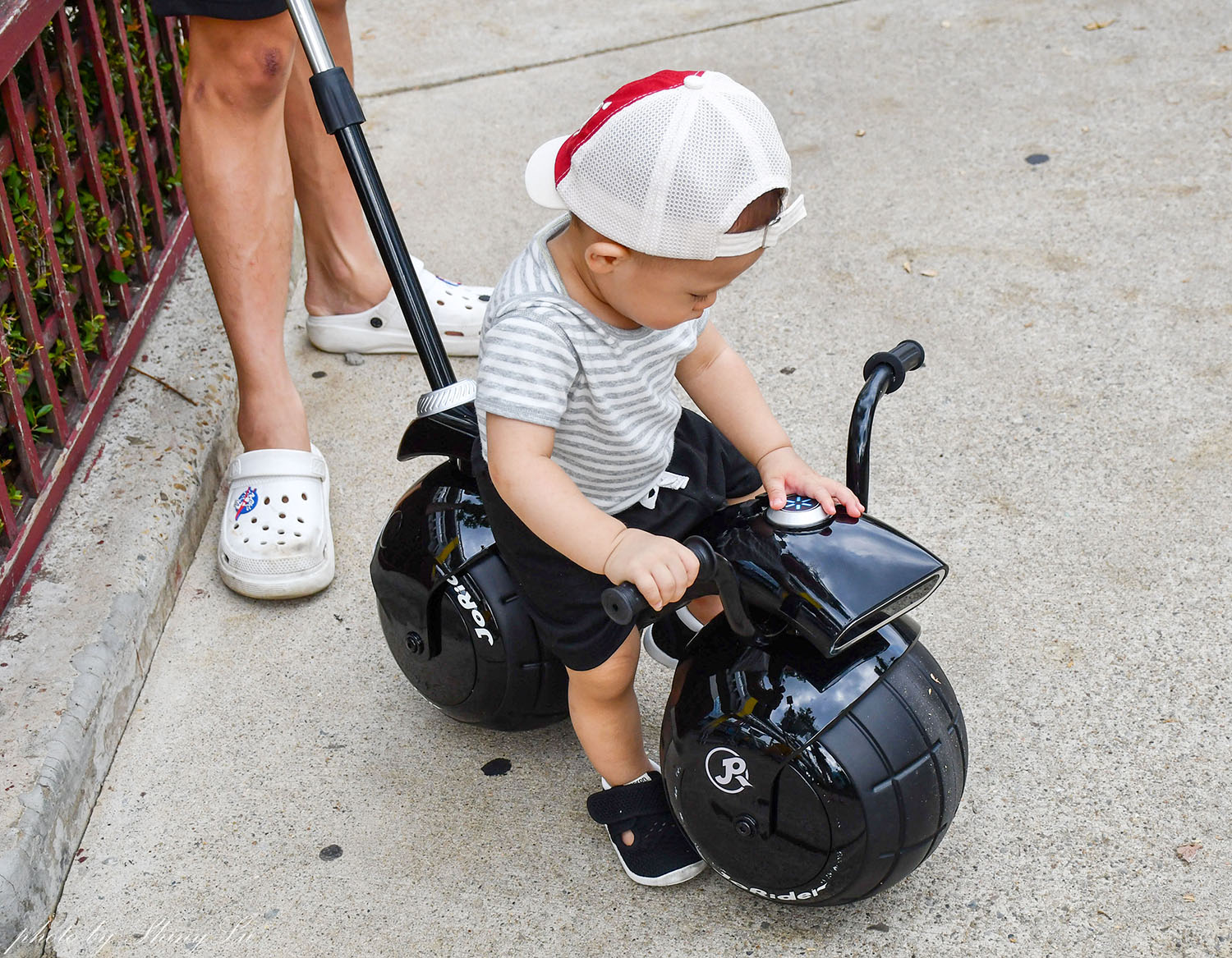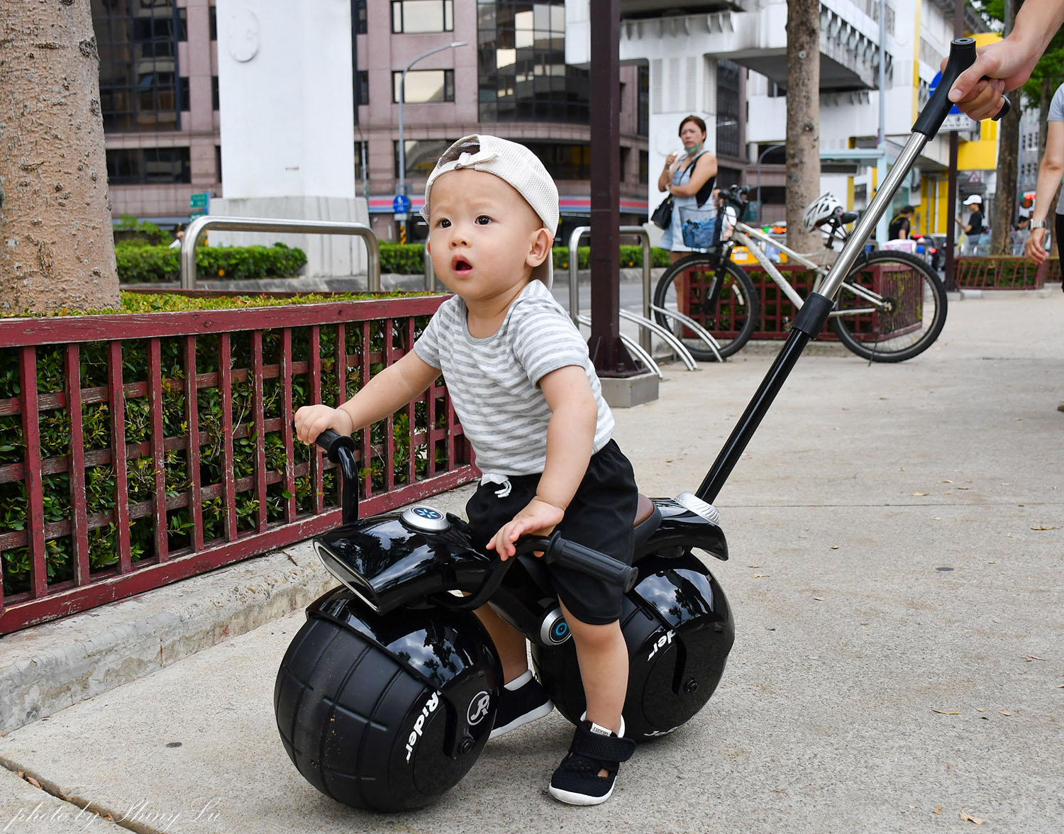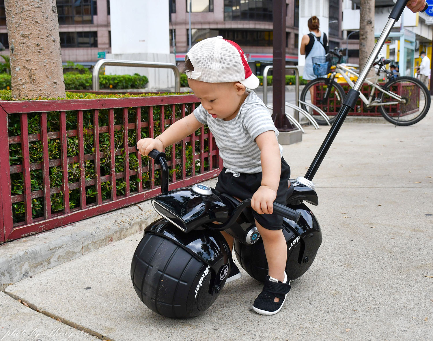所以,弟弟大約玩了幾次後,馬上就上手了,現在開始知道手把可以控制方向,懂得如何左右轉,他才一歲二個月耶!就可以玩得很開心,現在只要出門,都一定要推這台「 JoRider平衡滑行車」出去呢