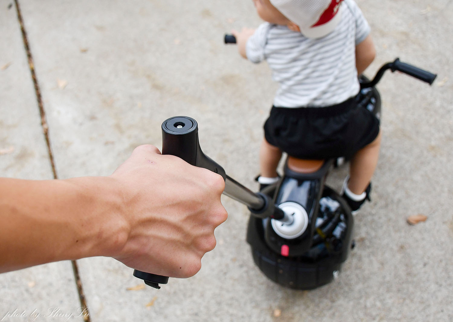 這台的特色,就是由寶寶自己來學習如何控制方向,因為不是三輪車,若騎車過程不小心要跌倒了,家人可以用推杆來協助寶寶維持平衡